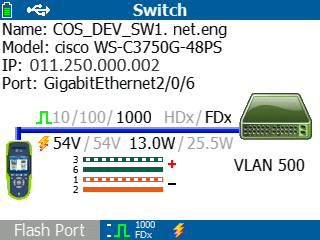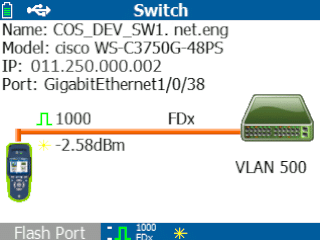 Der LinkRunner AT zeigt wichtige Informationen zum nächstgelegenen Switch an, darunter: