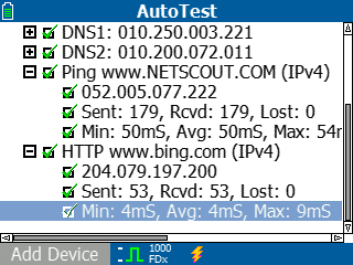 Der LinkRunner AT führt zur Überprüfung der Verbindung entweder einen Ping- oder einen TCP-Port-Open-Test durch. Die Verbindung zum Standard-Gateway, bevorzugten DNS-Server und alternativen DNS-Server sowie die entsprechende Antwortzeit werden getestet.