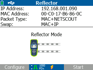 Der Paket-Reflektormodus des LinkRunner AT ermöglicht, dass er während der Durchgangstests als Remote-Gerät verwendet wird, so dass LAN- und WAN-Durchgangskapazitäten mit Geschwindigkeiten von bis zu 1 Gbit/s getestet werden können. Der Reflektormodus kann zum Tausch der MAC- und/oder IP-Adressen konfiguriert werden.