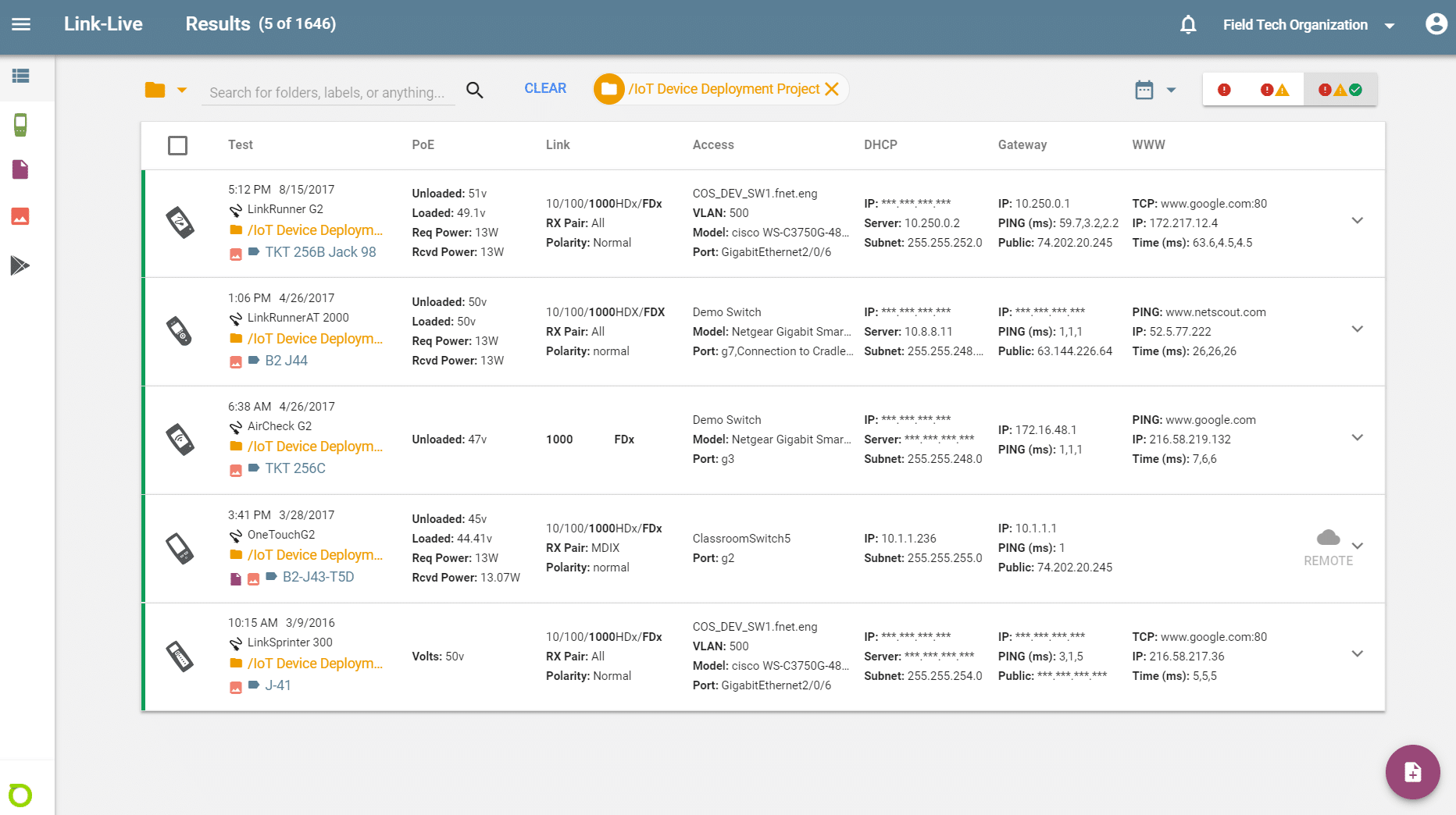 Mit Link-Live können Testergebnisse von den tragbaren Netzwerk-Prüfgeräten LinkSprinter, LinkRunner AT, LinkRunner G2, AirCheck G2 und OneTouch AT automatisch hochgeladen werden, wodurch der Benutzer eine einheitliche Ansicht der Ergebnisse der verdrahteten und der Wi-Fi Netzwerk-Konnektivität erhält.