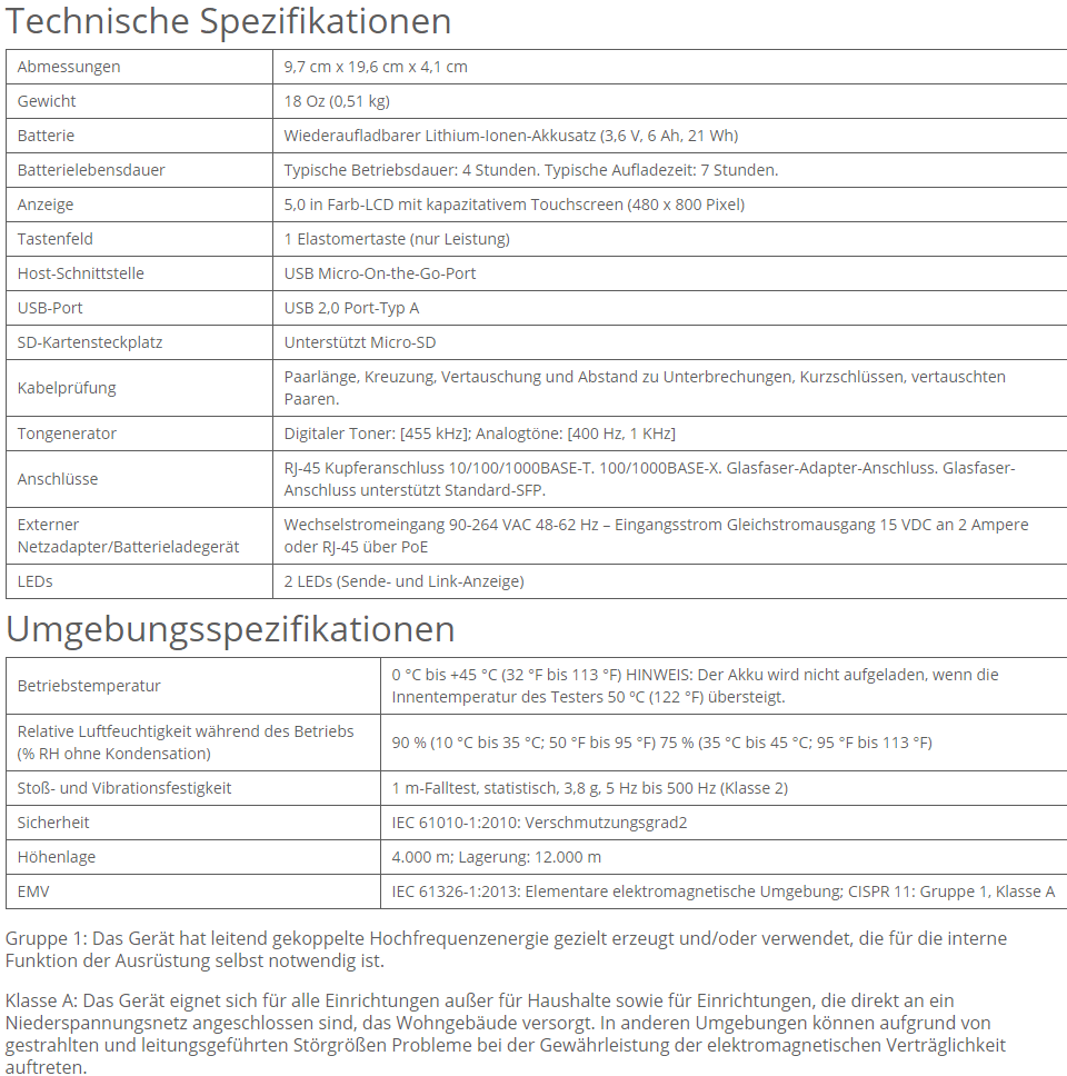 Der LinkRunner G2 ist ein robuster tragbarer Smart-Tester für den Einsatz vor Ort. Der integrierte Lithium-Ionen-Akku bietet drei Tage Standby-Zeit und vier Stunden Dauerbetrieb und wird bei jedem Anschluss an eine PoE-fähige Verbindung oder über das Netzteil wieder aufgeladen.