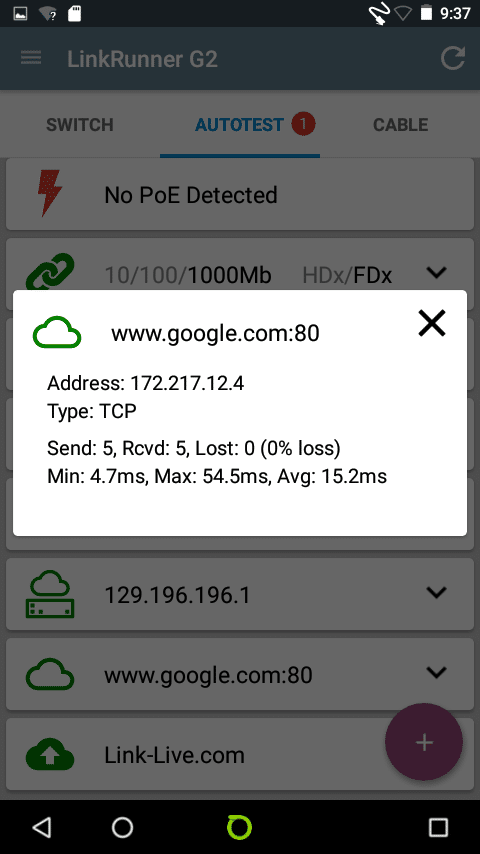 Neu in LinkRunner G2 ist die Fähigkeit, lästige intermittierende Verbindungsprobleme mittels kontinuierlicher Pings schnell und einfach aufzufinden.