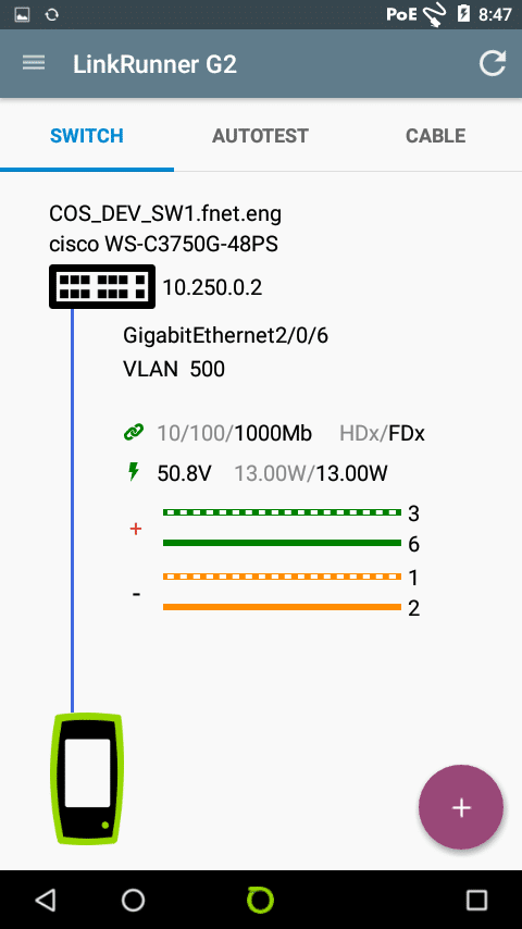 Führen Sie den Switch-Test aus, um die Netzwerkverbindung mit 10/100/000 Mbps über Kupfer und 100/1000 Mbps über Glasfaser zu verifizieren. Der LinkRunner G2 verwendet das IEEE Link Layer Discovery Protocol (LLDP) und die Cisco und Extreme Discovery Protocols (CDP und EDP), um VLAN, Sprach-VLAN und das nächstgelegene Switch-Modell sowie Slot und Port anzuzeigen.