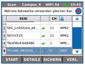 Der LanXPLORER Pro kann sich zur Fehlerdiagnose nicht nur über die WLAN-Schnittstelle (2.4GHz 802.11b/g/n) mit dem Netzwerk verbinden, sondern auch den WLAN-Standort selbst analysieren und die Kennung des Zugangspunktes, die Signalstärke, den Kanal und den Verschlüsselungsstatus anzeigen. So ist es möglich, die Ursachen für langsame WLAN-Netze oder Verbindungsstörungen, wie sich überlappende Funkkanäle oder eine falsche SSID-Einstellung, zu ermitteln. Beim Anschluss des LanXPLORER Pro zwischen WLAN-Zugangspunkt und Netzwerk ist es möglich, die größten Bandbreiten-Verbraucher sowie die gesamte Bandbreitenbelegung (überlasteter Zugangspunkt) zu ermitteln.