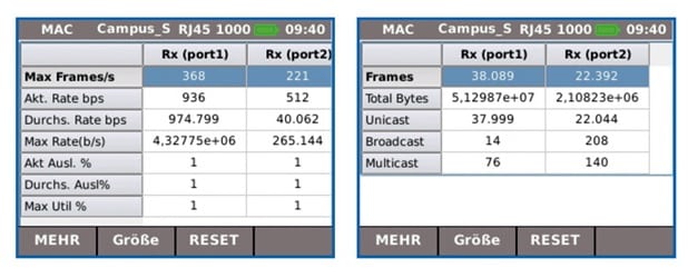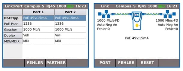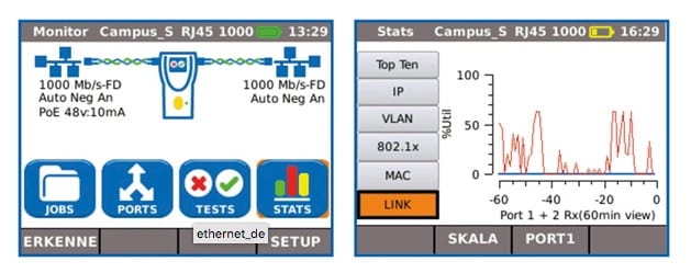 Ethernet-Durchgangsprüfung am Gerät bis 10/100/1000 Mbit/s.