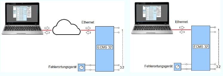Ein besonderes Merkmal des ECMS 32 Kabelüberwachungsgeräts ist die Möglichkeit zum Fernzugriff über die Ethernet-Schnittstelle. So lässt sich das Gerät sowohl lokal über einen PC als auch remote steuern, wodurch eine flexible Telekommunikationskabelüberwachung und Steuerung möglich ist. Das ECMS 32 fungiert dabei als HTTP-Server, was die Verwaltung und das Monitoring über das Internet vereinfacht. Weitere Funktionen umfassen die Möglichkeit, individuelle Grenzwerte für die Alarmierung einzustellen, automatische E-Mail-Benachrichtigungen bei Abweichungen zu versenden und den Zugriff auf detaillierte Überwachungsdaten zu gewährleisten.