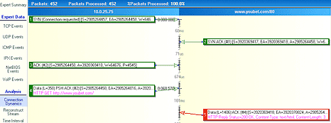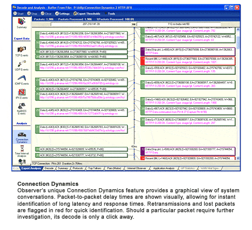 Die im Netzwerkanalysator Observer integrierten TCP/UDP-Experten alarmieren Sie bei Problemen wie z.B. „Excessive Retransmission“ und liefern eine Erklärung des Problems, sowie mögliche Ursachen. Eine Besonderheit im Observer ist die Darstellung „Connection Dynamics“. Sie zeigt die IP-Verbindung graphisch dar, um zu lange Latenz- und Antwortzeiten zu erkennen.
