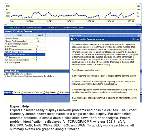 Mit Observer Expert können Sie schnell und sicher Probleme lokalisieren und deren Ursache mit unserer Experthilfe finden. Observer Expert besteht aus dem Netzwerk Analysator Observer Standard plus dem Experten System, mit dem Automatisch Lösungen gefunden werden. Des Weiteren ist eine Applikationsanalyse bis Layer 7 möglich.
