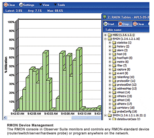 RMON ist ein Industriestandard für Netzwerkverkehr- und Datenerfassung auf Paketebene. Observer Suite unterstützt RMON- und HCRMON-Standards und lässt Sie jedes RMON-konformes Gerät einschließlich Router, Server und Hardware-Probes überwachen. Konfigurieren Sie Schwellwerte und Alarme, und lassen Sie sich automatisch informieren, wenn Probleme auftauchen.