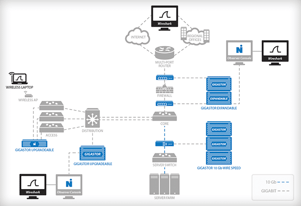 Observer Platform: Mehrere kritische Applikationen, die über 10- oder 40-GbE Verbindungen „laufen“, erzwingen die Frage: „Kann ein Analysator diese Last wirklich verarbeiten?“. Die realistische Antwort lautet – Nein. Sie können versuchen, verschiedene Filter einzubauen und dadurch die aufnehmbare Lasten reduzieren. Aber eine effektive Fehlerbehebung beinhaltet eine Analyse aller Pakete. Um Verfügbarkeit der Applikationen zu garantieren, benötigen Sie ein Netzwerkgerät wie z. B. GigaStor, welches diese hohen Lasten leicht verarbeiten kann.
