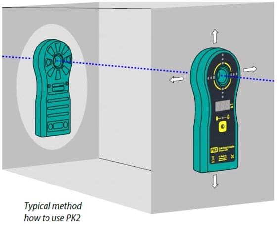 Die LED Richtungsanzeige funktioniert bis 150cm dicken Wänden zuverlässig. Zudem zeigt Ihnen das Bohrpunkt Ortungsgerät Vesala PK2 die exakte Wandstärke an. Der Sender wird mittels Klebemasse, die rückstandfrei wieder entfernt werden kann, an die Position geklebt, an der später der Bohrer austreten soll. Schauen Sie sich das Video dazu an. Mit dem Empfänger wird nun die exakte Position des Senders, bzw. des Bohrer-Ansatzes, gesucht und festgelegt.