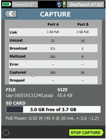 Erfassen Sie den Datenverkehr in drahtgebundenen und WLAN-Netzwerken für VoIP- und AutoTest, wenn eine Ansicht auf Paketebene erforderlich ist, um ein Netzwerk- oder Anwendungsproblem zu lösen. Filtern Sie den Datenverkehr zur Erfassung essenzieller Informationen. Exportieren Sie die Erfassungsdatei auf einen PC, zur Dekodierung und Analyse der Ergebnisse mit einer Protokollanalyse-Software. Erfassen Sie den Datenverkehr in drahtgebundenen Netzwerken an einem einzelnen Port, an zwei aggregierten Ports oder inline zwischen einem Client-Gerät und dem Netzwerk. Durch die Inline-Erfassung werden Komplexität, Zeitaufwand und Kosten minimiert, die mit eigenständigen TAPs oder der Konfiguration von Switch-Mirror-Ports verbunden sind. Erfassen Sie den WLAN-Datenverkehr nach Kanal und Modus (20 MHz oder 40 MHz+).