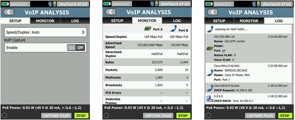 VoIP-bereit: Das G2-Modul des OneTouch Kabelmessgerät untersucht Desktop SIP/SCCP-basierte VoIP-Probleme in Echtzeit mit Inline-Anrufüberwachung, -Protokollierung und -Auswertung.