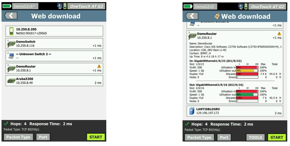 Erkennen Sie automatisch Geräte mit Kupfer- und Glasfaserkabelanschluss sowie wichtige Geräte-Eigenschaften. Wählen Sie aus 14 verschiedenen Möglichkeiten, um unterschiedliche Ansichten des drahtgebundenen Netzwerks zu erhalten. Sortieren Sie beispielsweise nach IPv4- oder IPv6-Adresse, um bereits verwendete und verfügbare Adressen zu identifizieren. Sie können auch nach Switch-Name/ -Steckplatz/ -Port sortieren, um zu ermitteln, wo im Netzwerk Geräte angeschlossen sind. Sortieren Sie nach erkannten Problemen, um schnell potenzielle Probleme identifizieren zu können. Zusätzliche erkennungsunterstützte Analysetools helfen bei der Fehlerbehebung und Profilerstellung. So ermöglicht zum Beispiel das Multiport-Statistik-Tool einen Einblick in Statistiken für Switch, Router und AP-Anschluss, einschl. Geschwindigkeit, Duplex, Steckplatz, Port, VLANs, Host-Zähler, Auslastung, Verwerfungen und Fehler. Das Devices on Port-Tool liefert Ihnen Informationen über, an einen beliebigen Switch Port angeschlossene Geräte (devices). Das Pfadanalyse-Tool stellt eine Schicht 2- und 3-Trace-Route vom OneTouch AT zu einem Zielgerät bereit, einschließlich der Zeit für jeden Schritt sowie Port-Statistiken für SNMP-Switch und -Router.
