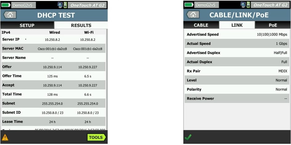 Für größere Probleme bietet OneTouch eine komplette Reihe von Troubleshooting-Tools für Gigabit-, Faseroptik- und Wi-Fi-Netzwerke, von Kabel/RF-Integrität bis hin zu Anwendungs-Performance-Tests.