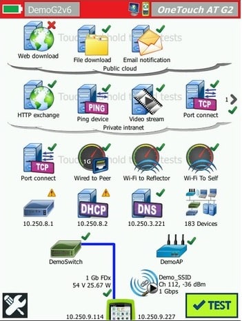 Eine Stunde Testzeit in nur einer Minute erledigenTesten Sie alle in einem Profil definierten Funktionen mit dem One-Touch AutoTe in kürzester Zeit. Der AutoTest beginnt in der physikalischen Schicht des Netzwerks und verläuft über die drahtgebundene und drahtlose Infrastruktur bis zu den Netzdiensten und benutzerdefinierten Anwendungstests. Klare Pass-/Fail- und Warnindikatoren weisen auf potenzielle Probleme hin. Ein Pass-/Fail-Indikator im oberen Bereich gibt den Gesamtstatus auf einen Blick an.