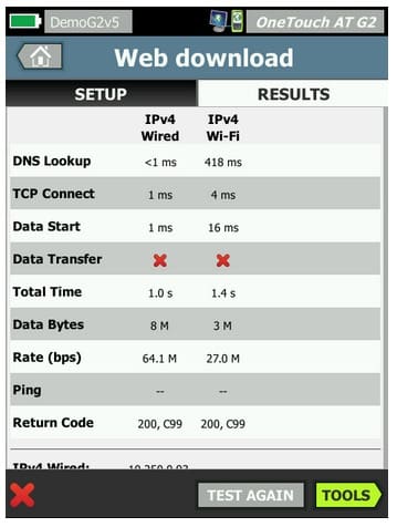 Die Messergebnisse werden nebeneinander angezeigt, damit Sie die Leistung der drahtgebundenen bzw. WLAN – und IPv4 / IPv6-Komponenten miteinander vergleichen können. Hier ein paar Beispiele: Pingen Sie Ihren WLAN-Controller, stellen Sie die Verbindung zum Port 2000 auf Ihrem VoIP-Anruf-Manager her, laden Sie eine Seite einer Anwendung mit einer Weboberfläche herunter, laden Sie eine Datei von einem Server hoch oder herunter, melden Sie sich bei einer Multicast-Gruppe an, greifen Sie auf Videoinhalte von einem On-Demand Streamingvideo-Server zu oder senden Sie eine E-Mail oder SMS an Ihr Mobiltelefon.