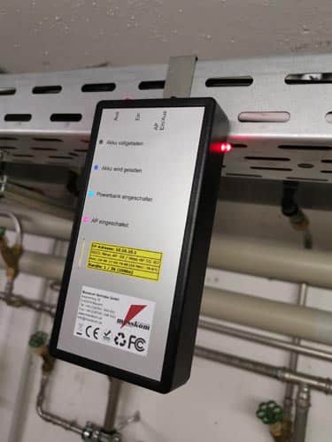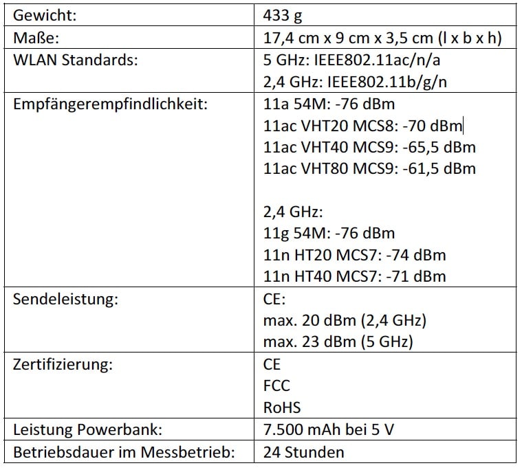 Unser Mess‐AP wiegt nur 433g und hat die Maße: 17,4 cm x 9 cm x 3,5 cm (l x b x h). Das Gerät hat eine eingebaute Stromversorgung für den integrierten Access Point, die eine Betriebsdauer von bis zu 24 Stunden ermöglicht. Die im Mess‐AP integrierte leistungsfähige Powerbank ermöglicht neben dem Betrieb des Mess-AP´s auch das Laden weiterer elektronischer Geräte über die eingebaute USB‐Buchse. Die integrierte Powerbank ist eine Eigenentwicklung mit einer hocheffizienten Ladeelektronik, die eine Energieausbeute von 99 % ermöglicht. Eine größere, separate Powerbank für den Betrieb und die Aufladung elektronischer Geräte mit noch höherem Energiebedarf ist bereits in Entwicklung.