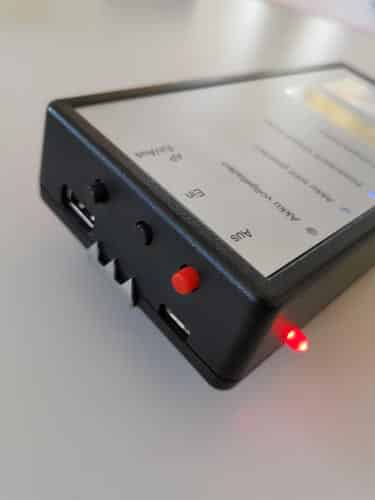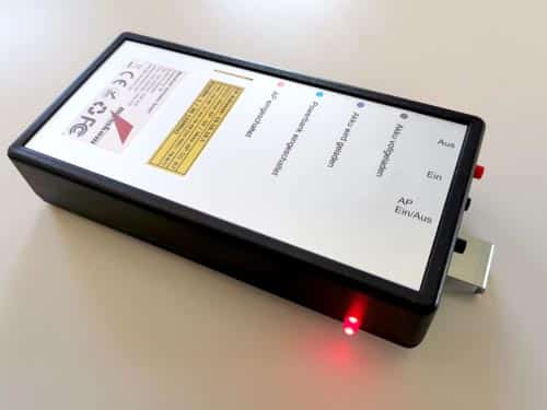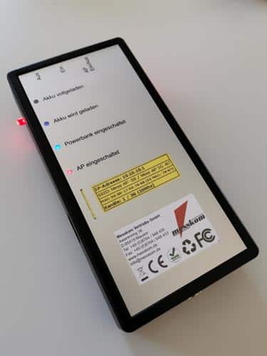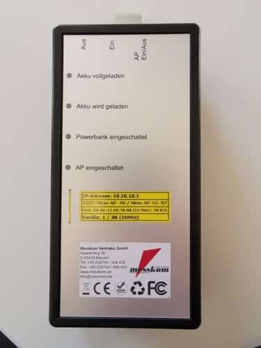 Unser Mess‐AP wiegt nur 433g und hat die Maße: 17,4 cm x 9 cm x 3,5 cm (l x b x h). Das Gerät hat eine eingebaute Stromversorgung für den integrierten Access Point, die eine Betriebsdauer von bis zu 24 Stunden ermöglicht. Die im Mess‐AP integrierte leistungsfähige Powerbank ermöglicht neben dem Betrieb des Mess-AP´s auch das Laden weiterer elektronischer Geräte über die eingebaute USB‐Buchse. Die integrierte Powerbank ist eine Eigenentwicklung mit einer hocheffizienten Ladeelektronik, die eine Energieausbeute von 99 % ermöglicht. Eine größere, separate Powerbank für den Betrieb und die Aufladung elektronischer Geräte mit noch höherem Energiebedarf ist bereits in Entwicklung.